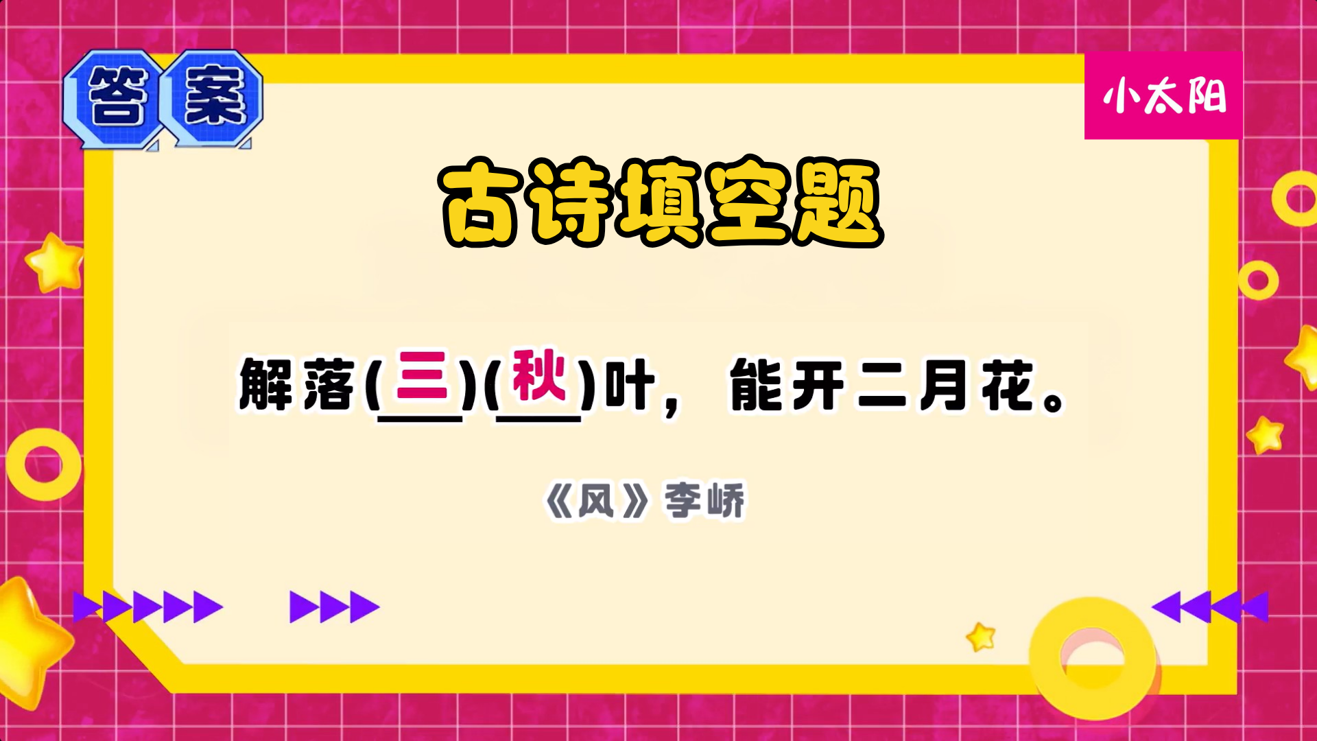 古诗填空题🖌️你有听说过唐代诗人李峤吗?前半句是“解落(?)(?)叶”,后半句是“能开二月花”。需要补上哪两个字,才能完成他的这首《风》呢?