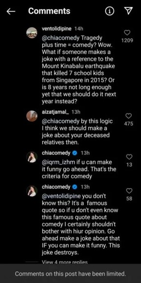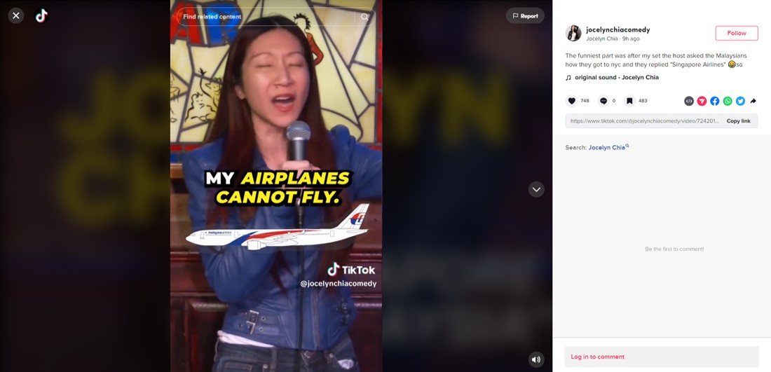 新加坡脱口秀演员Jocelyn Chia近日在演出期间公开吐槽大马,并拿MH370空难开玩笑,引起网民集体挞伐。失言风波延烧至今,Jocelyn Chia 已经关闭其社交媒体帐号,而这起事件也引起马新两国政府的关注。
