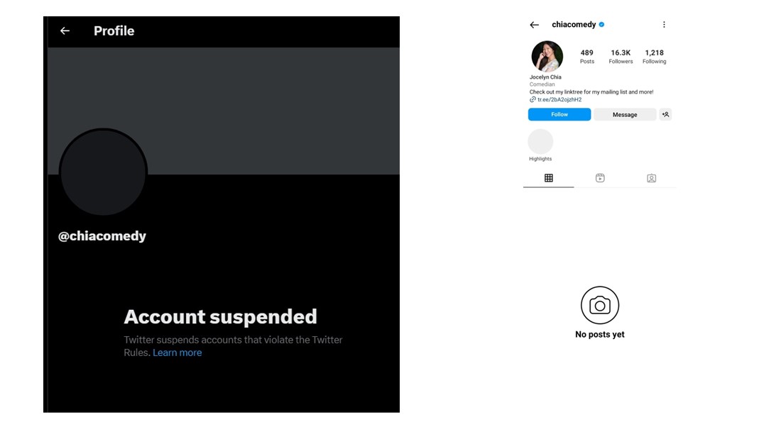 当事人Jocelyn Chia的社交媒体账户,包括推特和IG账户,疑似遭大量网民举报而被关闭。