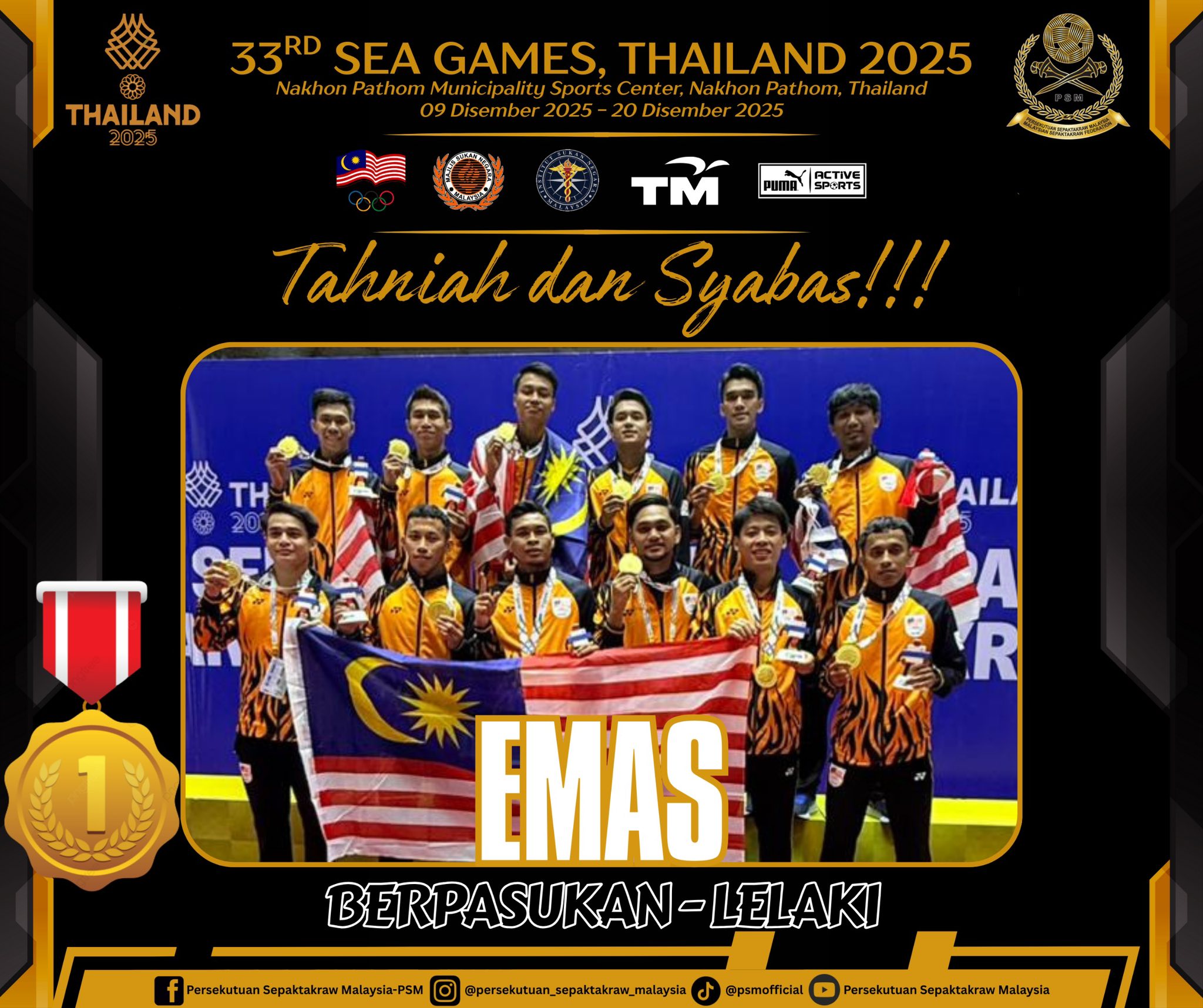 大马藤球队阔别34年重夺男团单组赛金牌 (图源: Persekutuan Sepaktakraw Malaysia - PSM 面子书)