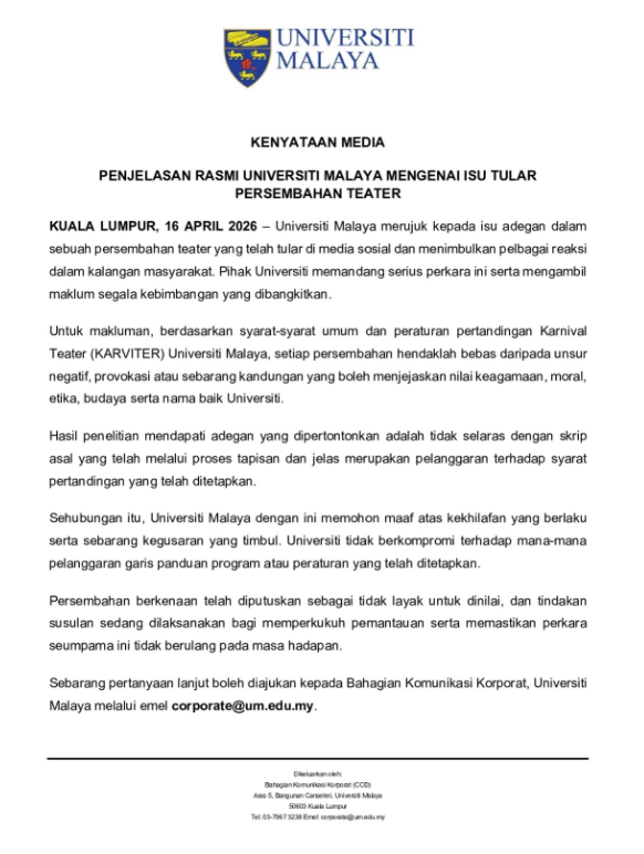 马来亚大学一场学生戏剧演出因被指涉及不雅内容,引发争议。高教部呼吁国内各高等学府,应加强对学生创作活动的引导与监督,确保艺术表达不触及社会敏感界限。